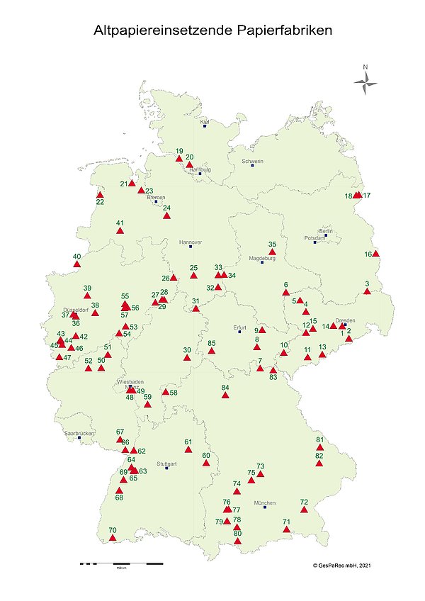 Die GesPaRec verfügt zur Zeit über eine Deutschlandkarte mit Adressenliste von 85 altpapiereinsetzenden Firmen.